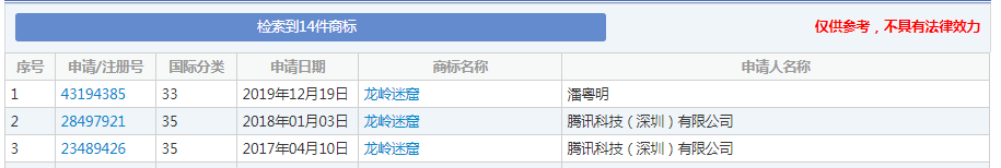 “龙岭迷窟”商标,出品方腾讯也申请了两件,主演潘粤明申请一件。