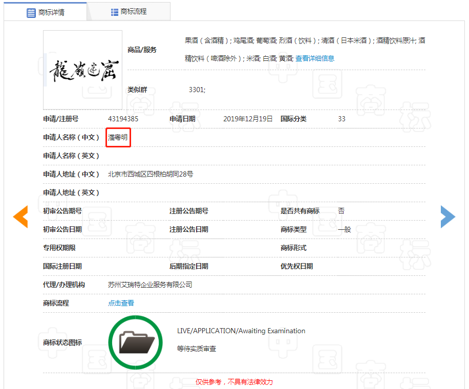 “龙岭迷窟”在酒上的商标被潘粤明申请了。