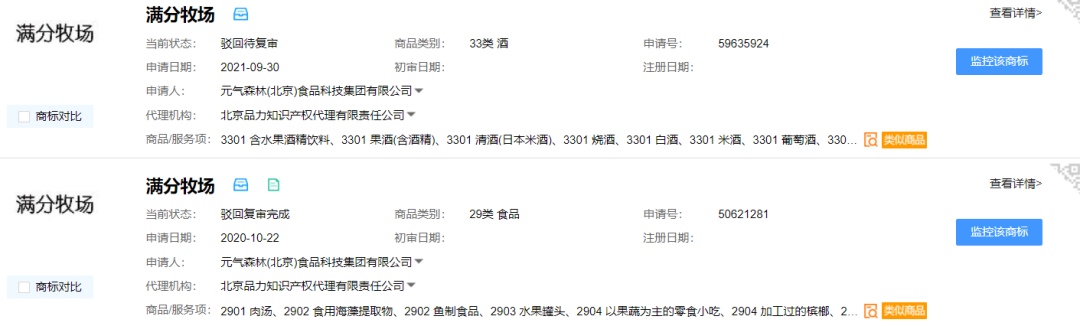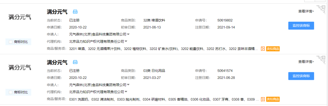 值得关注的是,这并非元气森林唯一一个被驳回的“满分”系列商标。据权大师显示,元气森林曾于2021年5月开始分别申请“满分元气”、“满分家族”、“满分!”、“满分牧场”、“满分”、“满分号”等多个“满分”系列商标,国际分类涉及啤酒饮料、酒、食品、餐饮住宿、方便食品、医药等。